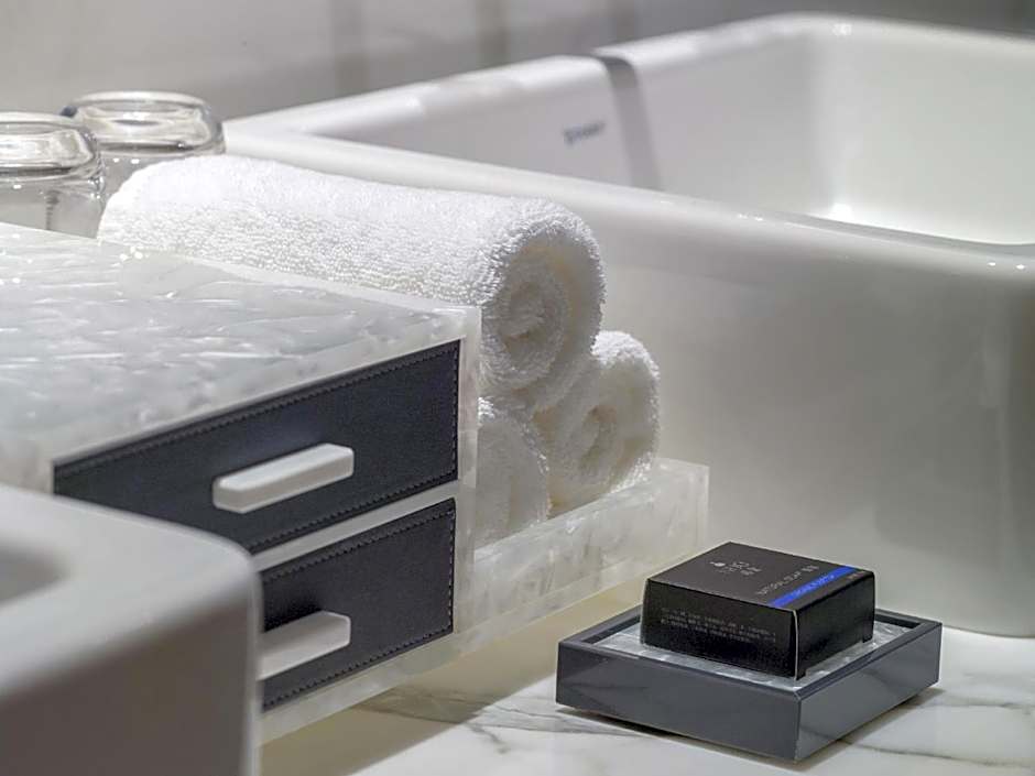 Located on the upper floors, the room has floor-to-ceiling windows, Ming-styled seating area and an executive writing desk. The bathroom features a bathtub with views across the city.
