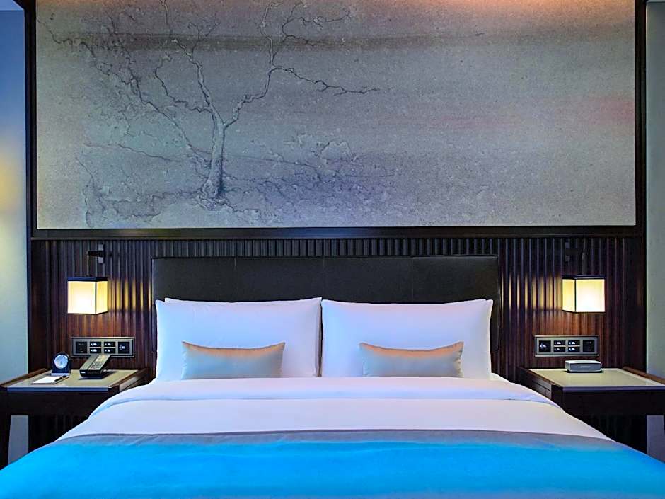 The room has floor-to-ceiling windows, Ming-styled seating area and an executive writing desk. The bathroom features a bathtub with views across the city. Room offers access to Executive Club Lounge.